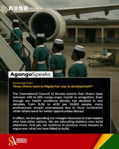 The International Council of Nurses reports that Ghana loses between 400 to 500 nurses every month to emigration. Even though our health workforce density has doubled in two decades, from 16.56 to 41.92 per 10,000 people, many professionals remain unemployed due to fiscal constraints, while others leave for better opportunities abroad. In effect, we are spending our meagre resources to train healers who heal other nations. We are educating builders who build elsewhere.
