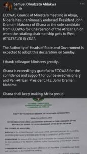 “Ghana is exceedingly grateful to ECOWAS for the confidence and support for our beloved visionary and Pan-African President, H.E. John Dramani Mahama,” Ablakwa stated.