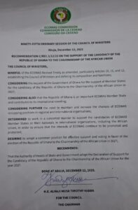 The ECOWAS Council of Ministers, meeting in Abuja, Nigeria, has unanimously endorsed President John Dramani Mahama of Ghana as the sole candidate from the West African bloc for the position of Chairperson of the African Union when the rotating chairmanship comes to West Africa in 2027.