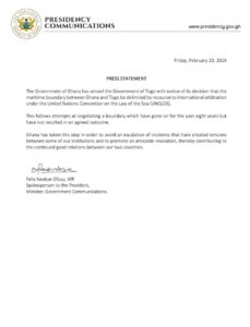 In a statement, Felix Kwakye Ofosu, Ghana’s minister for government communications, confirmed that Accra will seek a binding delimitation of the offshore boundary under the United Nations Convention on the Law of the Sea, the global framework governing maritime disputes