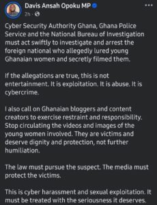 “Cyber Security Authority Ghana, Ghana Police Service and the National Bureau of Investigation must act swiftly to investigate and arrest the foreign national who allegedly lured young Ghanaian women and secretly filmed them,” he wrote.