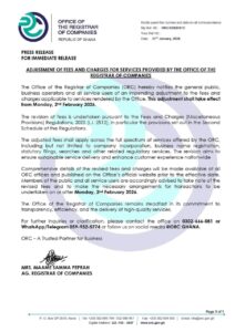 The Office of the Registrar of Companies has announced that fees for its services will rise beginning Monday, February 2, 2026, in accordance with new government regulations.