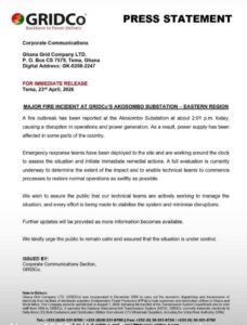 In a press statement issued by the Ghana Grid Company Limited on Thursday April 23rd,2026, the incident occurred at approximately 2:01 p.m., affecting operations and power generation.