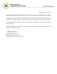 In a statement issued by Felix Kwakye Ofosu, the presidential spokesman and minister of state for government communications, the presidency said Mr. Mahama would continue on to Davos, Switzerland, to take part in a session of the World Economic Forum.