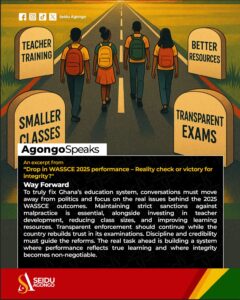 While it is important to find the root cause the 2025 WASSCE results to be able to institute measures against a repeat, it is advisable to detach politics and emotions from the debate and focus on how to reset the entire education system to regain the confidence of external stakeholders. In the meantime, we must continue to maintain the crackdown on malpractice with transparent sanctions, invest in stronger teaching through smaller classes, better resources, and continuous teacher training, and remove politics from education so performance reflects learning, not scorecards.